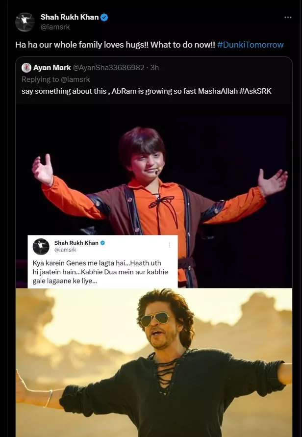 After the annual day festival, Shah Rukh Khan hosted an Ask Me Anything session on his social media handle. One of his fans took the opportunity and asked him what he thinks about AbRam’s copying his signature pose. Like a proud father, Shah Rukh Khan happily chimed that their entire family loves hugs. He wrote:
