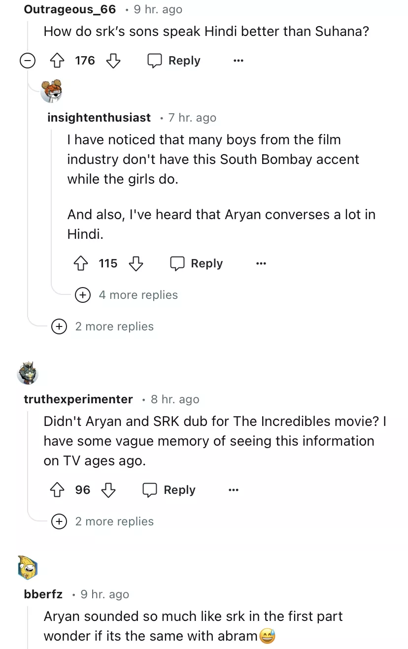 Defending AbRam, a fan shared that it would be the star kid’s debut as a voice-over artist. One of the netizens hinted at how Shah Rukh’s son has better control of their Hindi language and wrote, “How do srk’s sons speak Hindi better than Suhana?” One of the fans also commented on how Aryan Khan first gave his voice in the film, The Incredibles.