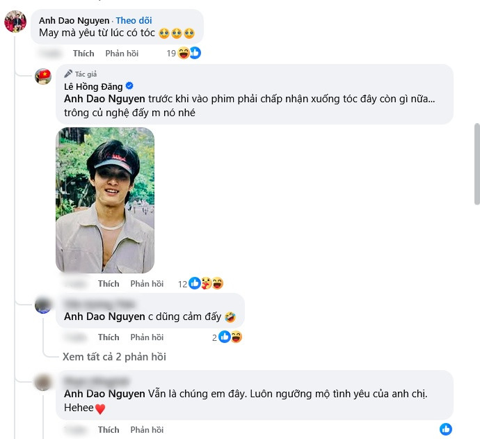 Dưới bài đăng, bà xã Hồng Đăng cũng để lại bình luận dí dỏm: “May mà yêu từ lúc có tóc”.