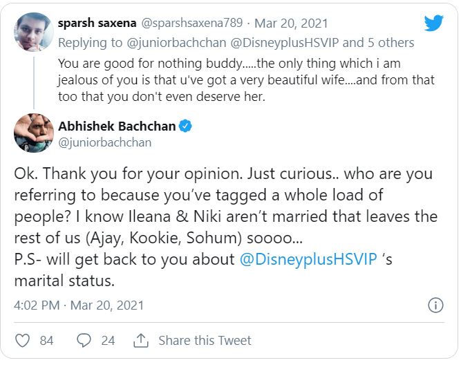 Once again, Abhishek Bachchan proved his humility with a reply to the troll, who called him ‘good for nothing’. Reacting to the trailer of Abhishek’s film, The Big Bull, a Twitterati wrote, “You are good for nothing buddy…..the only thing which i am jealous of you is that u’ve got a very beautiful wife….and from that too that you don’t even deserve her.” Abhishek replied on Twitter, “Ok. Thank you for your opinion. Just curious… who are you referring to because you’ve tagged a whole load of people? I know Ileana & Niki aren’t married that leaves the rest of us (Ajay, Kookie, Sohum) soooo… P.S- will get back to you about @DisneyplusHSVIP’s marital status.”