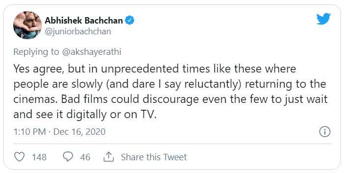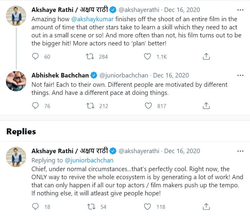 In December 2020, when film distributor, Akshaye Rathi had complimented Akshay Kumar for his speed in delivering films and had commented how more actors need to plan better, Abhishek Bachchan had responded with why it is unfair to draw such comparisons. Akshaye had tweeted, “Amazing how @akshaykumar finishes off the shoot of an entire film in the amount of time that other stars take to learn a skill which they need to act out in a small scene or so! And more often than not, his film turns out to be the bigger hit! More actors need to ‘plan’ better!” To which, Abhishek had replied, “Not fair! Each to their own. Different people are motivated by different things. And have a different pace at doing things.”