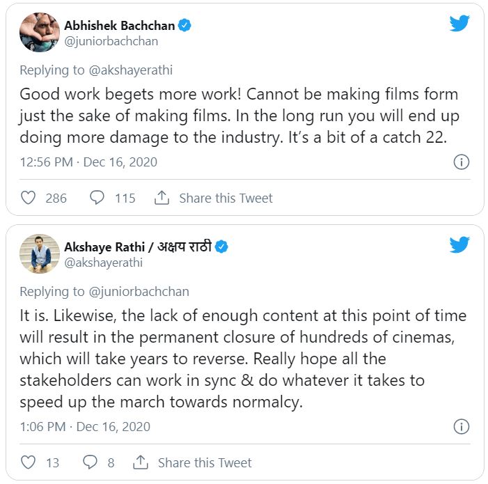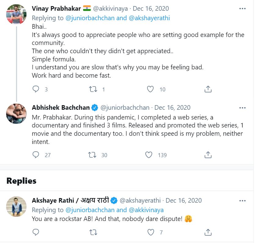 That didn’t end there as it led to a debate between the two and it was soon joined by a Twitterati, who had advised Abhishek Bachchan to ‘work hard and become fast’. The user had written, “Bhai… It’s always good to appreciate people who are setting good example for the community. The one who couldn’t they didn’t get appreciated… Simple formula. I understand you are slow that’s why you may be feeling bad. Work hard and become fast.” To this, Abhishek had responded, “Mr. Prabhakar. During this pandemic, I completed a web series, a documentary and finished 3 films. Released and promoted the web series, 1 movie and the documentary too. I don’t think speed is my problem, neither intent.” Clarifying that his comments were being misrepresented, Abhishek had said, “Koi bhi judge nahin kar raha bhai Saab. Akki bhaiya ki work ethic or professionalism. Kabil-e-tareef hai.”